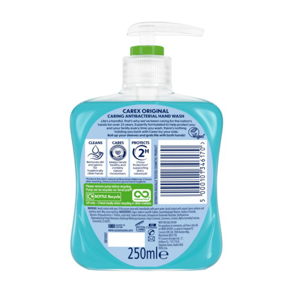 Carex Anti-Bacterial Original hand soap in a convenient pump action 250ml bottle.