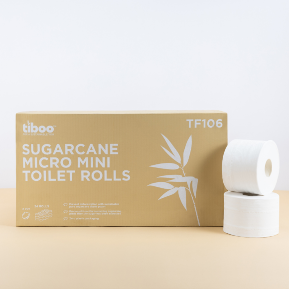 This sustainable Mini micro 2Ply toilet roll is made from bagasse a waste product of Sugarcane that previously would have been burnt or discarded in to landfill, they have a high quality bright white and soft finish to them due to the short fibres in the bagasse.