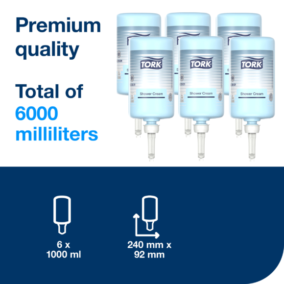 Tork Shower Cream for hotels, schools and sports facilities is a caring and moisturising shower cream formula with a refreshing unisex fragrance that leaves your skin feeling soft. Save cleaning staff time with effortless refilling in less than 10 seconds (based on internal panel test soap refilling time). This refill is suitable for Tork Liquid & Spray Soap Dispensers, which are certified easy to use and provide good hygiene.