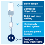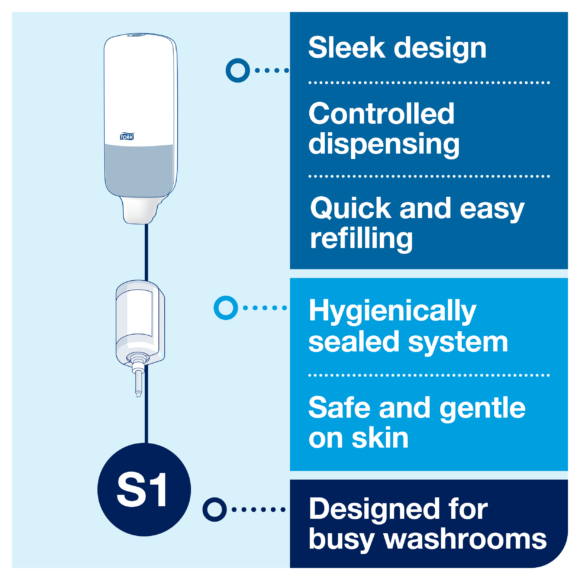Promote hand hygiene with Tork’s soap and sanitiser dispenser that fits one soap liquid, sanitiser or spray soap cartridge. It’s suitable for all types of washrooms – even those in demanding environments. Certified by the Swedish Rheumatism Association, it’s easy to operate by all, including those with gripping issues, children and the elderly.