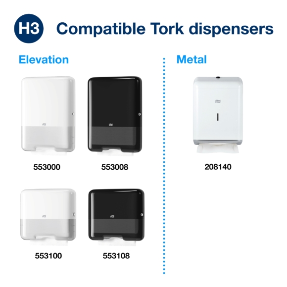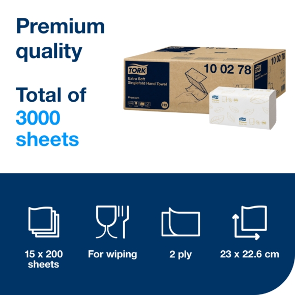Tork Singlefold extra soft hand towel white 100278 H3 (3000) is Tork’s Singlefold Hand Towel system providing Single sheet dispensing. This system is ideal for public environments. This extra soft 2 ply towel is the ultimate in luxury hand drying. It consists of 2 “V” fold panels/folds and a sheet size of 23 x 23 with 15 bundles of 200 sheets. Designed to fit standard Single fold hand towel dispensers and the Tork H3 dispensers.