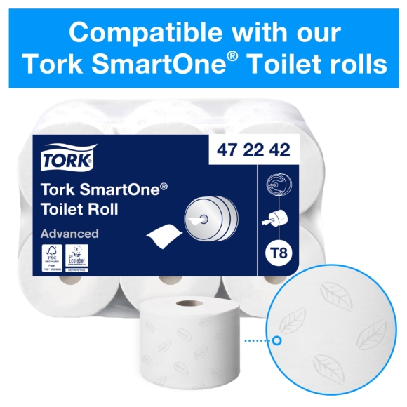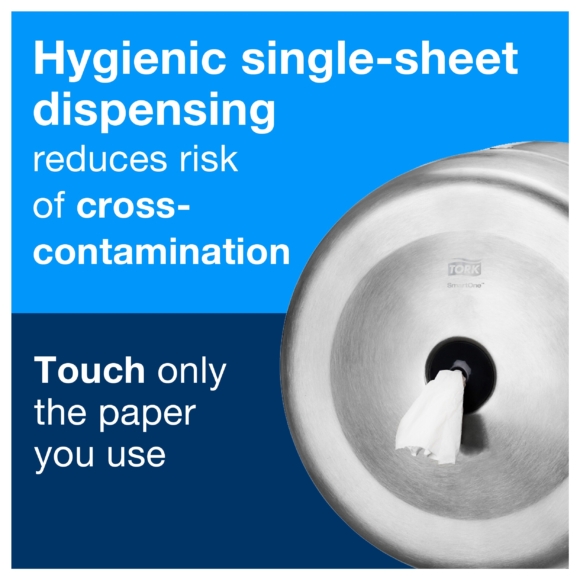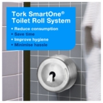 This robust stainless steel Tork SmartOne® Toilet Roll Dispenser is an efficient dispensing system, suitable for demanding washrooms with high traffic. It serves more guests between refills, thanks to its high capacity and ability to limit waste. Improve hygiene and reduce consumption by up to 40% compared with traditional jumbo toilet roll dispensers, thanks to single-sheet dispensing that minimises contact. Rolls are also protected from contamination and damage in demanding environments by the handy lock feature.