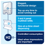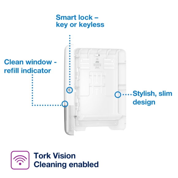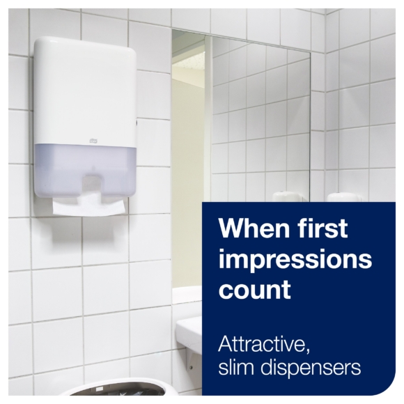 Impress guests in low to medium-traffic washrooms with the premium look of the Tork Xpress® Multifold Hand Towel Dispenser. Plus, reduce waste and boost your environmental credentials with one-at-a-time dispensing, which cuts consumption of paper towels and improves hygiene. Your staff will also appreciate making fewer refill runs – this towel dispenser has a high capacity that can fit up to 2.5 bundles, meaning more people are served in one go.