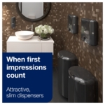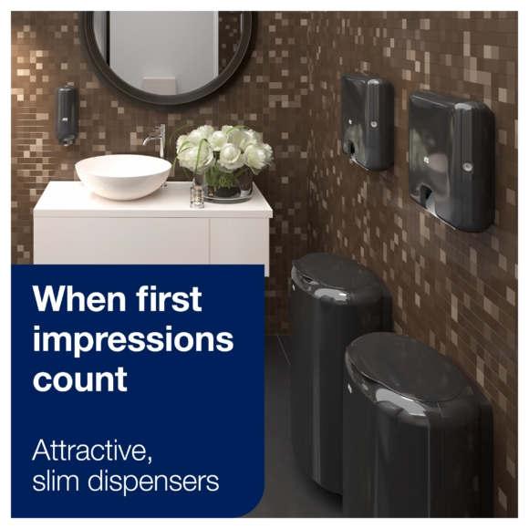 For smaller washrooms with low to medium traffic, the compact Tork Xpress® is the ideal hand towel dispenser. It dispenses paper towels quickly and easily without taking up much space, mounting discreetly onto the wall. It makes a good impression, thanks to its slim design and high-gloss finish. Reduce waste and limit cross-contamination, as this dispenser allows guests to take one towel at a time. See-through windows also allow staff to easily know when towels are running low.