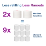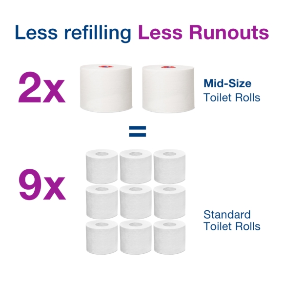- Contains up to 270 meters of toilet roll maximising time between changes